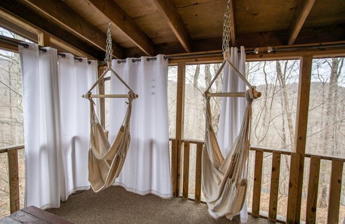 You will find a gas grill, plenty of outdoor seating, and a new hot tub on the expansive open patio. The screened porch beside the patio features an outdoor dining table, more comfy outdoor seating, and two fun hammock-style suspended chairs. At the front of the cabin is the covered front porch with a porch swing and level entry into the main floor. There is level entry into the lower floor. The wood-burning fire pit, an easy walk from the front porch, features pastoral mountain views, natural mountain surroundings, and Adirondack-style armchair seating. The gravel driveway with parking at the front and a one-car attached garage six steps down from the front door to the side provides ample parking for numerous vehicles.