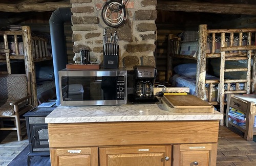 Kitchen area has a Refrigerator with freezer on top, 3 burner propane cook top, drip coffee maker, crock pot, electric skillet , microwave, large toaster oven, and 2 slice toaster. Dishes, flatware, Pots and pans provided. Inside Dining area seats 6. We provide coffee, filters, creamer, sugar, ketchup, mustard, salt and pepper for your use. Outside propane BBQ grill with side burner.