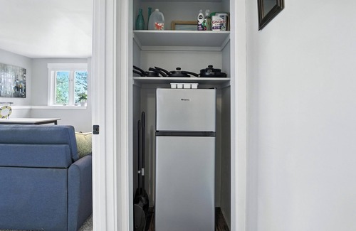 Perfect for light cooking or extended stays, the kitchenette includes a stove, microwave, refrigerator, dishwasher, sink, Keurig coffee maker, and all the essentials: plates, mugs, utensils, cookware, and complimentary K-cups and bottled water.