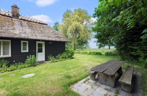 This charming thatched-roof holiday home offers stunning sea views and a prime location in the first row in Strøby Ladeplads, right by a family-friendly beach. Comprising three bedrooms, including one with a double bed, one with single bed, and a loft with bunk beds, the accommodation comfortably sleeps up to six guests. Two bathrooms, one featuring a shower and underfloor heating, provide convenience. The spacious living room features a cozy sitting area with a TV (no German channels) and a separate dining area, complemented by a fireplace that enhances the inviting atmosphere. A well-equipped kitchenette includes a gas/electric stove, microwave, dishwasher, and coffee machine. The home also provides Wi-Fi, a washing machine, and energy-efficient heating. Outside, a covered terrace invites relaxation with garden furniture, all set within a tranquil, nature-rich area that attracts diverse wildlife.