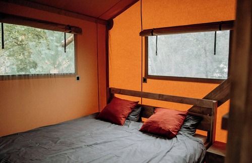 Enjoy the Ultimate Indoor-Outdoor Experience in These Spacious Safari Tents!These fully equipped safari tents provide the perfect base for an adventurous getaway. Located in various spots throughout our park, you’ll find them both at our pop-up glamping and in a lively festival-style setting close to all central facilities. Want to secure your favorite location? Simply select a specific spot on the map when booking!After a day full of exploration, unwind in the soft, cozy beds of your safari tent. Each tent features two bedrooms:One bedroom with a double bedOne bedroom with a single bed and bunk beds (suitable for children up to 12 years old)Space for a cot, if neededThe tent is designed for comfort and convenience, offering private sanitary facilities and a fully equipped kitchen with:DishwasherCoffee filter machine (No. 4)Fridge/freezer combinationKitchen inventory (kitchen linen available for booking)Cooking spaceIn the cozy living area, there’s a dining table for shared meals, and each safari tent includes a private veranda, perfect for soaking up the summer sun. With plenty of space, these safari tents can comfortably accommodate up to 5 people, making them ideal for families or small groups.