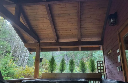 Post and beam timbers shelter the cabin's exterior living space from the elements for year-round enjoyment. The private and carefully maintained hot tub welcomes an evening soak. A couple chairs and propane barbeque round out the deck.