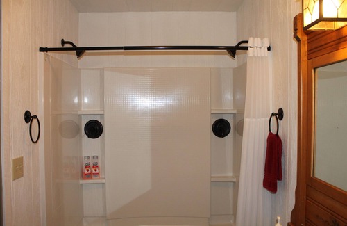 The bedroom is equipped with one queen sized bed and one twin bed which makes this cottage the perfect fit to sleep two to three guest. The bathing area features a extra large shower with double heads and a beautiful Victorian dresser re-purposed as a vanity. The Salt and Pepper Shaker Museum is wheelchair/handicap friendly for all to enjoy. For more info visit fiddlestix village dot com.