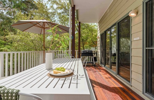 The deck is large, open and private. It has a lovely bush aspect, a BBQ and an outdoor dining setting as well as a bird feeder for up close encounters. There is also an outdoor shower and a lovely bush path that leads down to the beach.