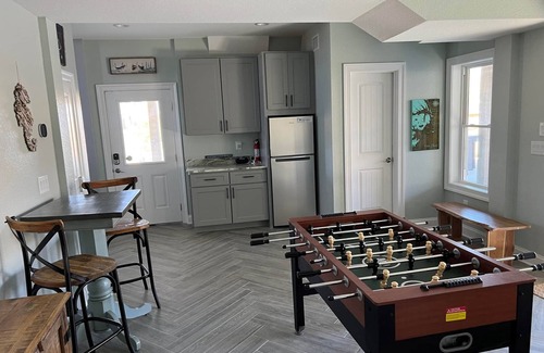 Inside accommodations at Salty Shenanigans are just as fabulous as the outdoor space. All five bedrooms (4 Kings, 1 bunkroom that sleeps 5) have their own private bathrooms and feature access to their own balcony or deck space. The spacious great room ties together the kitchen, dining, and living spaces. It features a large, fully equipped kitchen with two dishwashers and induction cooking. The refrigerator has two ice makers to help keep your drinks cold all week long (more ice available from firehouse), and extra refrigerators in the rec room and tiki bar provide more space for your food and beverages. You can choose to eat at the kitchen bar area or at our large 12 person dining table while enjoying ocean views. Have your morning coffee or evening cocktail up in the cozy ship watch, where you can watch the sunset and sunrise from the same spot! The rec room on the bottom floor offers plenty of fun for rainy days or a break from the sun. An arcade machine, games, TV and bar area offer plenty of activities for young and old alike.