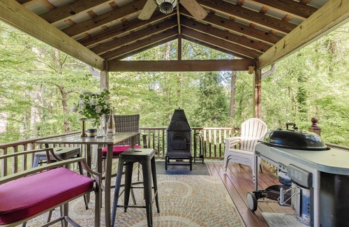 Serenity Mountain Home is steps from Main Street Saluda yet wrapped by Bradley Nature Preserve.