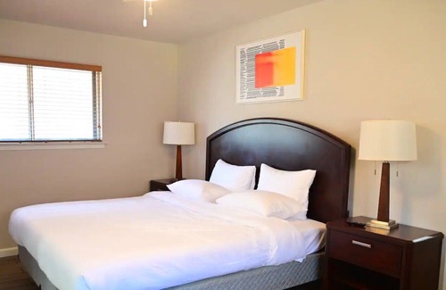 There are comfortable bedrooms, each with a plush queen-sized bed and plenty of closet space. The bathroom has all the essentials, including fresh towels and toiletries