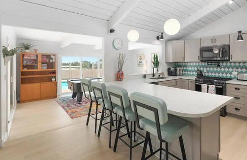 Welcome to San Diego Oasis, a retro retreat--a mid-century modern oasis in sunny San Diego! This stylish home combines classic charm with all the modern upgrades you desire. Unwind by the sparkling pool, enjoy a friendly game of air hockey or corn hole, board games or enjoy s'mores around the gas fire pit . The retro retreat is the perfect blend of comfort, convenience, and timeless design. SD's most popular attractions are all within a 20-30 minute drive. Only 20 minutes to the beach!