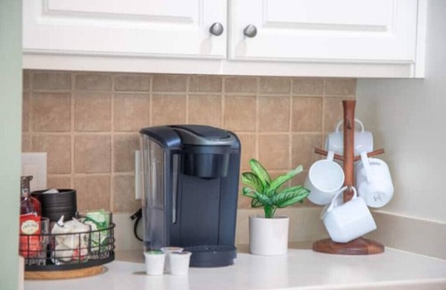 Large and exceptionally equipped, the kitchen is chocked full of thoughtful amenities for socializing, cooking and modern life. A window-filled kitchen dining nook overlooks built-in bird feeders (birdseed provided) for the daily parade of blue jays, cardinals, finches and myriad other birds, while the wooden pineapple-base table seats four. The kitchen island has four barstools. Kitchen amenities include: a built-in Champagne / white wine fridge, new refrigerator, modern gas range with dual ovens, Keurig coffee maker (regular and flavored pods included), Kitchen Aid professional mixer, new microwave oven, instant hot water dispenser, 4-slice toaster, dishwasher (soap pods included), in-sink food disposer, Breville panini-maker / flat top indoor grill, blender with drink spigot, upscale Chicago Cutlery knives, plus every conceivable kitchen tool and cookware imaginable in a large walk-in pantry. Overhead, natural fiber lighting sets a cheery mood over the granite island