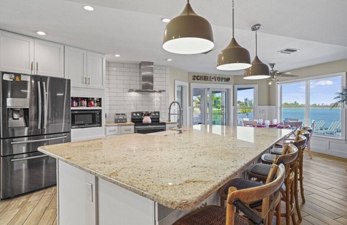 Coastal Beach decor throughout this amazing, recently rehabbed, spacious home with everything for your family vacation. Five bedrooms, three baths, sleeps up to fourteen. A jetted hot tub that waterfalls into salt water heated pool with amazing views. It feels as if the Lake is at the pool edge. We have so many amenities, kayaks, paddle board, bikes, outdoor shuffle board indoor converted garage game room, fishing gear, beach gear and more.
