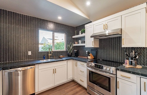 The house includes a completely remodeled kitchen with all new cabinets, granite, and stainless steel appliances. The kitchen is fully equipped for cooking and serving with three bar seats and eight-person dining table. Also includes a Keurig coffee maker, toaster, and microwave.