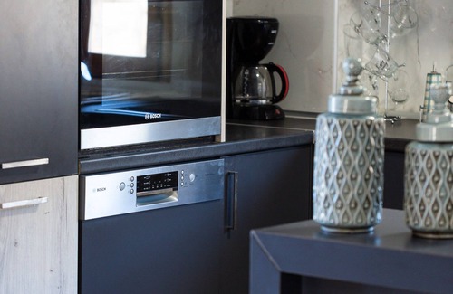 - Living Area: Open-plan space with a corner sofa, stylish coffee table, 48 Smart TV with Netflix, and a PlayStation 4.