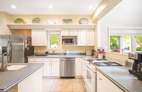 Enjoy a lake view from the private screened porch with a glass enclosure! There's room for the whole family in this spacious, updated townhome with a loft! Featuring new furniture (2016), a remodeled primary bath on the first floor, a concrete slab outside the sunroom with Adirondack chairs to view the pond, a rear screened porch, and a front patio, this coastal getaway has it all! The main level is home to a living and dining area, a well-equipped eat-in kitchen, a half bathroom, and a primary suite with a remodeled bathroom, while the top floor features the loft, full bathroom (shared by two bedrooms), and the second primary suite. Central air-conditioning, a washer/dryer (new for 2019), and a one-car garage with an extra refrigerator provide added convenience.