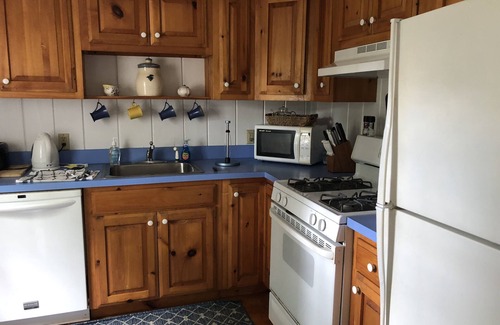 Pet ok with approval first. Bright and airy cottage sleeps max 5 (2 BR - 1Q, 2T) plus single pull out sofa bed in hi living room. A block by footpath from Ridgevale Beach. Linens included. No pets permitted. Classic beach cottage with original pine interior, now bright and freshly painted with updated modern conveniences (including a/c, WiFi, washer, dryer, dishwasher, smart TVs with cable). Water views and beautiful sunsets from large second-story sun deck (accessed via exterior stairs at back of house) with seating/dining table. Living room plus separate family room with dining area. Well-equipped kitchen. Bathroom has shower (no tub) plus a fully-enclosed outdoor shower at back of house to enjoy with hot/cold water.