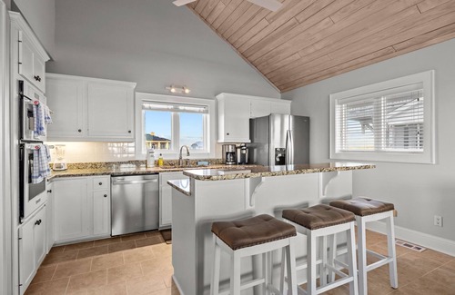 Venturing to the third floor, guests discover the vibrant heart of the home, the kitchen and living room. Bathed in natural light streaming through oversized windows, this inviting space offers a serene retreat for relaxation and socialization. The open kitchen, a culinary haven, equipped with modern amenities and adorned with panoramic ocean views. A spacious dining table provides the perfect setting for shared meals and lively conversation, fostering connections that linger long after the dishes are cleared. A convenient half bath completes this level, ensuring comfort for all. Adjacent to the kitchen, the living room seamlessly integrates indoor and outdoor living, inviting guests to enjoy panoramic ocean views and gentle sea breezes from the adjoining balcony.