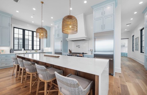 Welcome to Searenity, where luxury meets coastal charm in this brand-new beachfront sanctuary. This home, located in the exclusive enclave of Eleanor Beach, was professionally designed with your comfort and convenience in mind. It offers two separate living areas for large families who need a bit of extra personal space, plus four desk areas for catching up on work or gaming. You will enjoy the convenience of two washers and dryers, two refrigerator/freezers, two dishwashers, three beverage/wine fridges and two coffee nooks. Luxury finishes are found throughout the house, from motorized window treatments to solid teak patio furniture to plush gel-infused memory foam mattresses. The home also offers Sonos speakers and Tommy Bahama beach chairs and umbrellas to use during your stay.
