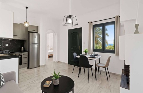 Inside, you'll find an open-plan layout with a dining area, fully equipped kitchen, two bedrooms, and a modernly designed bathroom. The first bedroom features a comfortable double bed and opens onto a spacious veranda. The second bright bedroom offers one cozy single bed with stunning views of Crete.