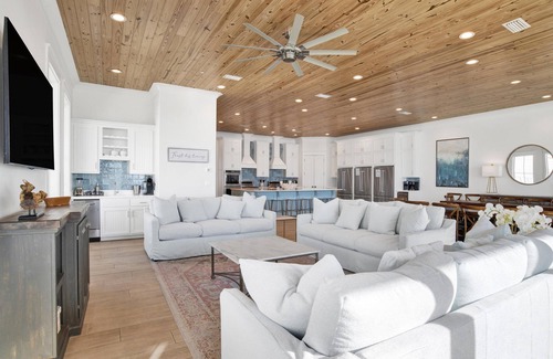 We stocked and equipped Seaside West’s gourmet-style kitchen to be able to feed an entire group with ease. Stainless steel appliances include 3 refrigerators, 3 dishwashers, and multiple cooktops and ovens. The indoor dining area seats up to 30+ people at two 12-foot tables. The sprawling kitchen island, located near the dining area, seats 6 more. On the deck, two more al fresco dining tables set the stage for an impressive sunset dinner in the gulf breezes.