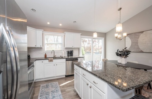Heading indoors, you’ll find a fresh and modern interior accented with comfortable furnishings and elegant décor. The cozy living room includes an L-shaped sofa and a smart TV, the perfect place for streaming a movie or your favorite shows. The open floorplan organically guides you into the kitchen, fully equipped for all your mealtime needs with stainless steel appliances, glossy countertops, and well-stocked cabinets. Lay out a spread of delicious afternoon hors d’oeuvres on the island, with high-top stool seating for 3 available for quick bites. The formal dining room table can seat 4, offering views and access out onto the back yard. Tap into your competitive side in the garage-turned-game room, including ping-pong and foosball tables as well as Jenga and Connect 4.