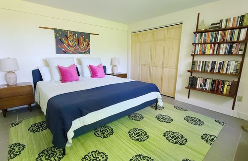 The open kitchen, dining and living area has cathedral ceilings and plenty of light. This home is nicely appointed and decorated with mid century modern flair. The living room has a flat screen television with cable and comfortable seating. The fully-equipped kitchen with stainless appliances is a delight for foodies. A slider off the dining area open to a deck with dining table and gas grill--the perfect place for your morning coffee or a barbecue. There are two bedrooms on the first floor, both with a queen bed. There are also two full bathrooms on the first floor, both with tiled showers with glass doors.