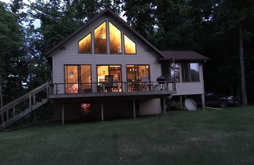 If you’ve forgotten what quiet sounds like then this place is for you. Four bedrooms plus a loft and a pullout will sleep up to 15. Two bathrooms plus central air and fiber optic high speed internet. Beautiful sunsets from the dock. Pontoon boat and two kayaks are included as well as a covered lift for your fishing boat should you decide to bring one
