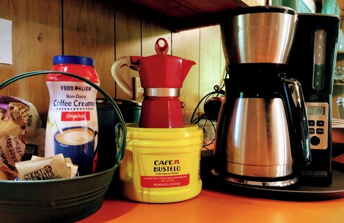 The kitchen has everything you’ll need to prepare meals at home, from cookware to spices, condiments, and coffee. Appliances include an air fryer, microwave, panini press, drip coffee maker and stovetop espresso maker.