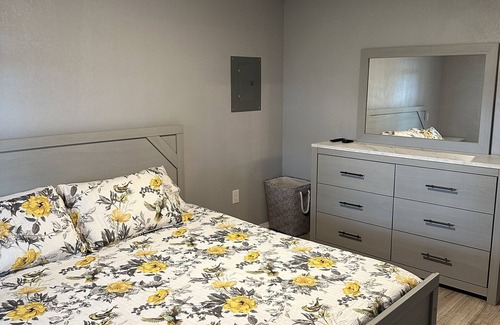 This suite was built to host up to 4 people. It offers one bedroom with a King size bed and bedroom furniture. The living room has a couch and love seat. The couch pulls out into a comfortable queen sized bed. There are TV's in the living room and bedroom. They are smart TVs with apple screen sharing capabilities. YouTube, Netflix, etc. Wi-Fi is included.
