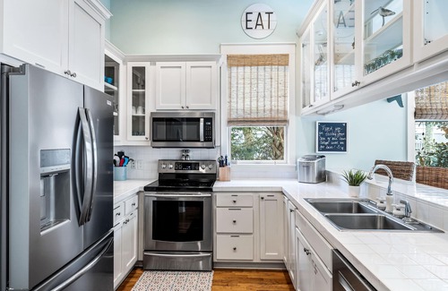A classic coastal one story cottage with hardwood floors, high ceilings, open living plan, inviting front porch with swing, & fully stocked kitchen.