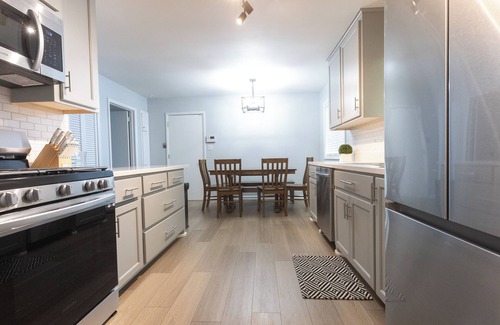 With busy lives, it is important to spend less time looking for a "Home Away From Home," when we travel. This gorgeous, newly remodeled home is located in a beautiful, tree-lined neighborhood one mile from St. Francis Hospital. The home has 3 bedrooms, one of them a master suite with a brand-new bathroom, and a guest bathroom that is also remodeled. Each bedroom has a TV with cable, beds to accommodate at least two, and large closets for storage during your stay. There is a king bed in the master, a queen bed in the middle room, and a twin-on-full bunk bed in the smaller bedroom. All the comfy bedding is provided along with plenty of towels and new front-loading washer and dryer for laundry. The living spaces include two living rooms with sitting areas, one with a sofa couch. The back living area includes a large TV with DirectTV. The kitchen includes an eat-in kitchen and a dining area. It is fully stocked with all the essentials for preparation of meals during each stay including new stainless-steel appliances. The eat-in kitchen includes a table that opens up to seat 8 with additional seating at the kitchen bar. There is a patio off one living room for that morning coffee. The patio then opens up to a large driveway with a gate and two-car garage at the back of the home for security. There is also a propane grill and a security system.