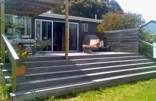 The deck flows out from the kitchen and dining area, and there is a separate sitting room with CD/DVD player and TV. There is a laundry with washer & dryer, and also an outside shower just perfect for when you come back from the beach.