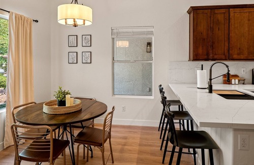 Come inside and discover a welcoming open plan living area where contemporary design meets cozy comfort. The stylish seating area is perfect for relaxing and watching TV, the dining area offers a great spot for shared meals and board games, and a dedicated workspace overlooks the back yard should business call! The sleek, modern kitchen is a chef’s delight featuring stainless steel appliances, granite countertops with bar seating for six, and a sunny breakfast nook. Families are well-catered for with a high-chair and pack-n-play, ensuring a stress-free vacation. Guests will also enjoy the property's premium sound blue tooth speaker.