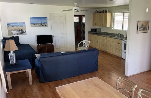 The lovely guest cottage on a gated beachfront lot (1/3 of an acre, large for Hawaii) is shared with the owner's home. There is an outdoor hot shower and toilet (in addition to the 1-1/2 baths in the cottage).