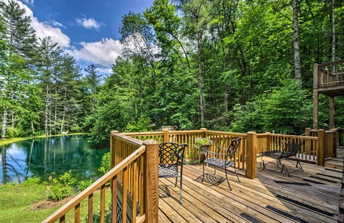 Leave your worries behind for a revitalizing rustic retreat at this 4-bedroom, 3-bathroom vacation rental home. Nestled in the North Carolina mountains, this A-frame home is encompassed by the natural wilderness and even boasts a private pond right in the backyard and a creek that runs through the property. Enjoy sitting on the covered deck in front of the cozy fire and listening to the running water or head down to the pond to sip a morning coffee while relaxing on the tree swing.