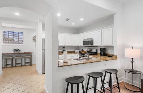The kitchen is fully equipped with modern appliances, sleek cabinetry, and ample counter space for preparing anything from a quick breakfast before the parks to a full dinner with family and friends. With three spacious bedrooms and three full bathrooms, this home easily accommodates families or groups of friends traveling together. Each bedroom is designed with comfort in mind, offering plush bedding, generous storage, and tranquil décor to ensure restful nights. The bathrooms are modern and convenient, providing privacy and ease for every guest.