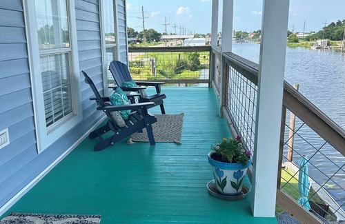 3bed 2 bath camp on the water great for groups or families. Sleeps 8 Front porch faces water to enjoy the sights and the breeze. Lights for night fishing and crabs caught right off the deck. Enjoy fishing, crabbing, boating, or swimming right off the deck. Full kitchen great for cooking meals, brick bbq pit with sink and counter to cleanfish, all linens provided, and parking under camp. A boat slip comes with camp to tie up a boat.