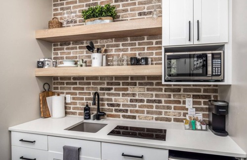 -Kitchenette with mini-fridge, microwave, cooktop, coffee maker, toaster, and dining supplies for 5