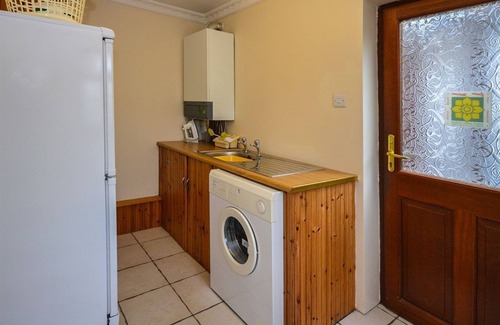 The utility room has a standing fridge/freezer, utility sink and a washing machine.