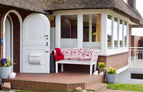 The guest house "Friedeburg" has been awarded 4 stars by the German Tourism Association. It has a thatched roof and is located on a mound in the quiet old town of Rantum, directly on the Wadden Sea dyke, with an unobstructed view of the Wadden Sea to the mainland and the neighboring islands to the south. The view from the window of the wohn. zimmers is an intense nature experience. Sunrise and sometimes moonrise, ebb and flow, birdwarmers, peace and lots of fresh air. Holiday is different here! In our house you will find two double rooms, two single rooms, one residential. room for our rooms, three comfortable apartments, two with south-facing terrace. Beach baskets and garden furniture invite you to relax behind the house on the terrace.