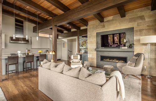 Sleek, contemporary style merges with rustic warmth and natural materials in the main level of this 2-story home. Step into the great room to find hefty wood beams, stylish light fixtures, and expansive windows framing nature and ridgeline views. The living space encourages cozy nights spent sipping cocoa and mixed drinks by the fireplace, with a soft couch, 2 accent chairs, and a nearby wet bar. The kitchen is well-designed for gourmet cooking with sleek countertops, a Wolf range, and a 3-stool breakfast bar that offers clear views of the living area and a round dining table for 6. Warm weather and bluebird days invite guests onto the vast deck—sip wine by the outdoor fireplace or relax with friends and family in the sitting area. When the evening winds down, retire to the peaceful primary bedroom boasting a king bed, a private bathroom, a gas fireplace, and deck access.