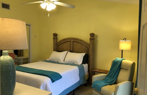 Condo complete studio apartment with a separate keyed entry in The Fountains building within the Paradise Lakes clothing optional resort development. The condo building is the second building from the entrance of Paradise Lakes Resort. The condo is on the top floor with high ceilings and an enclosed private screened balcony nature view, and easy elevator access. Full Bath and Fridge, Includes high Spd Wi-fi and loads of cable Tv and sports, Microwave, Toaster Parking at building, Broiler oven, Coffee maker, Lots of towels/ linen, blankets, mirrored room and lighting, A/c thermostat control, Private feel to the apartment a quik walk away to the common patio area close by with gas grills/ lounge chairs. Walk to Paradise Lakes Resort's pools, hot tub, nightclub, cafe, and bar. Restaurants, bars, Super Walmart, CVS nearby. Occasional golf carts available.