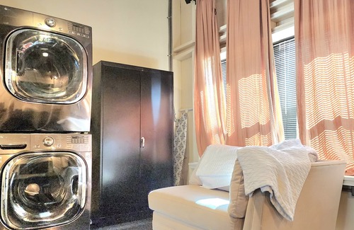 The fully-equipped kitchen is a standout feature, boasting modern appliances, including a dishwasher, providing every possible convenience. Additionally, the space is furnished with a full-size washer and dryer, eliminating the hassle of laundry day and offering added comfort for our guests.