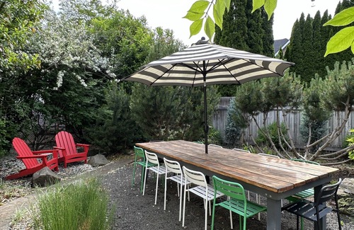 The cozy and private back yard is complete with a large dining table, which seats 12, a propane BBQ & cafe string lights for evening meals & hanging out.