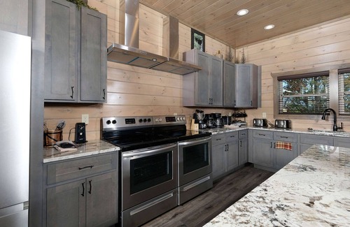 Nearby awaits the dining area and stylish, fully equipped kitchen with double the appliances (yes, there are 2 dishwashers), tons of counter space — including an island with log bar stools — and all the cookware, serving dishes, cutlery, and glasses needed to prep and serve large meals throughout your stay. All you need to bring are the ingredients and any specialty cooking items you may need! There's also a charcoal grill outside for cookouts at the cabin. And the large log dining tables are great for setting up board game competitions, with fun options already at the cabin.