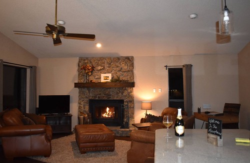 The upper floor is at the same level as the driveway so there are not any stairs to the entry of the house making it easy for entry. The upper level has the kitchen, dining for 8, living area with a fireplace, (wood is supplied), a desk, master bedroom /closet and an on-suite bathroom. Large glass windows capture the views of the mountain ranges. There is an upper deck with outside dining for 8, a kids table, and the grill.