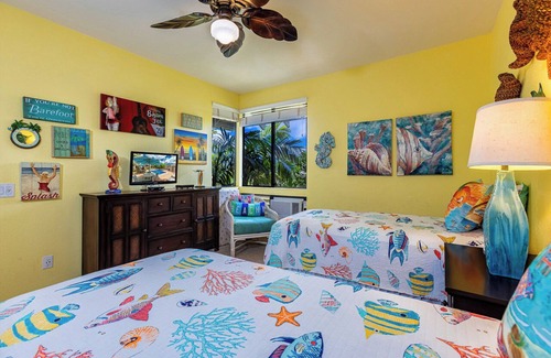 Experience a spacious and private two-bedroom top-floor unit, beautifully upgraded throughout. The living area is meticulously designed for indoor and outdoor living, featuring charming island-style furnishings, a fully equipped kitchen, granite countertops, beautiful wood cabinetry, a flat-screen television, and Wi-Fi throughout. Enjoy a tropical beverage on the lanai, take advantage of alfresco dining, and soak in the beautiful sunrises, mountain and fairway views.