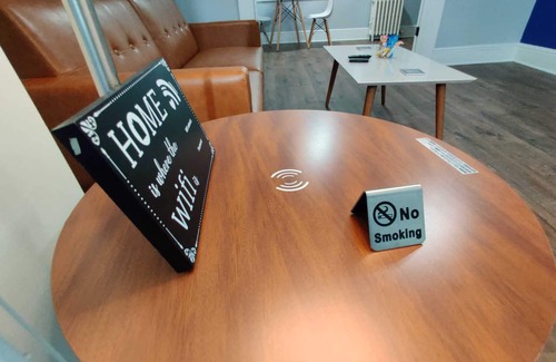 The apartment has smart lock keyless access with a smart thermostat and wireless charging table.