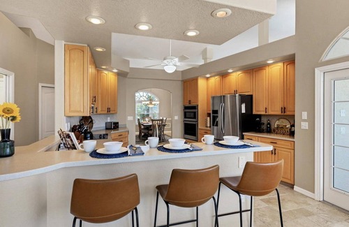 Updated touches throughout the house will make your stay relaxing, from enjoying the family room with the comfortable sprawling couch overlooking the pool and lanai, to the spacious kitchen and dining and formal living areas all perfect for entertaining.