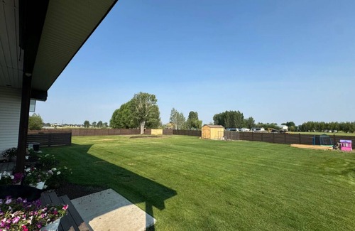 Welcome to Sage Haven Retreat, your perfect countryside escape with ample comfort and space. It features 5 Bedrooms & 2.5 Bathrooms. Enjoy 2 king beds, 2 queen beds, & 2 twin beds. Enjoy the large kitchen & living space. There is a huge fenced yard. Dogs are welcome to stay outside, in a provided kennel. Relax by the firepit, grill food, or enjoy the outdoor theater. Located less than 5 minutes to town, 10 min to fishing, 15 min to Sand Dunes, & less than 1 hour to Island Park and Yellowstone.