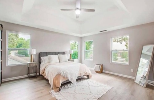 Get ready to relax in this 5-bedroom fully renovated house in Atlanta close to downtown and midtown. This serene property offers 3200 sq ft of large living space. With 5 queen beds everyone will have a comfortable place to rest. The 4.5 bathrooms are equipped with amenities that vary: a bathtub and shower. Two rooms downstairs, one with queen bed and an office with a couch & inflatable mattresses can be requested prior to the stay. Two spaces downstairs, a cozy living room w/ a futon & an office with 2-3 queen blow up mattresses available for larger groups upon request). 2 master bedrooms w/ 2 master bathrooms (1 w/ a soaking tub) upstairs & another large room with two queen beds. A nice loft space upstairs to watch tv & relax. Whether you're here for work or play, this enchanting property has everything you need. Home is great for filming (different fees apply). Close to the Tyler Perry Studios & airport.