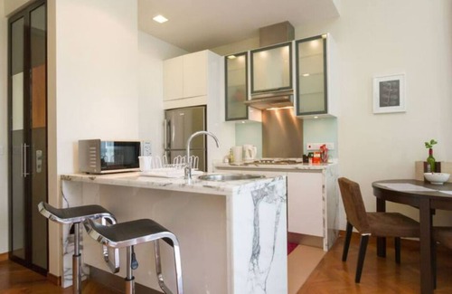 The Marina Suites at Straits Quay is a development by the famous E&O Hotel Group and touts incredible design and aesthetic sentiments. The unit is located right above easily-accessible waterfront restaurants, cafes, bars, boutiques, massage parlors, hair salons, bike rental, and Sam's Groceria (a grocery store with local and Western goods). Tesco and other restaurants are less than a ten minute walk away.